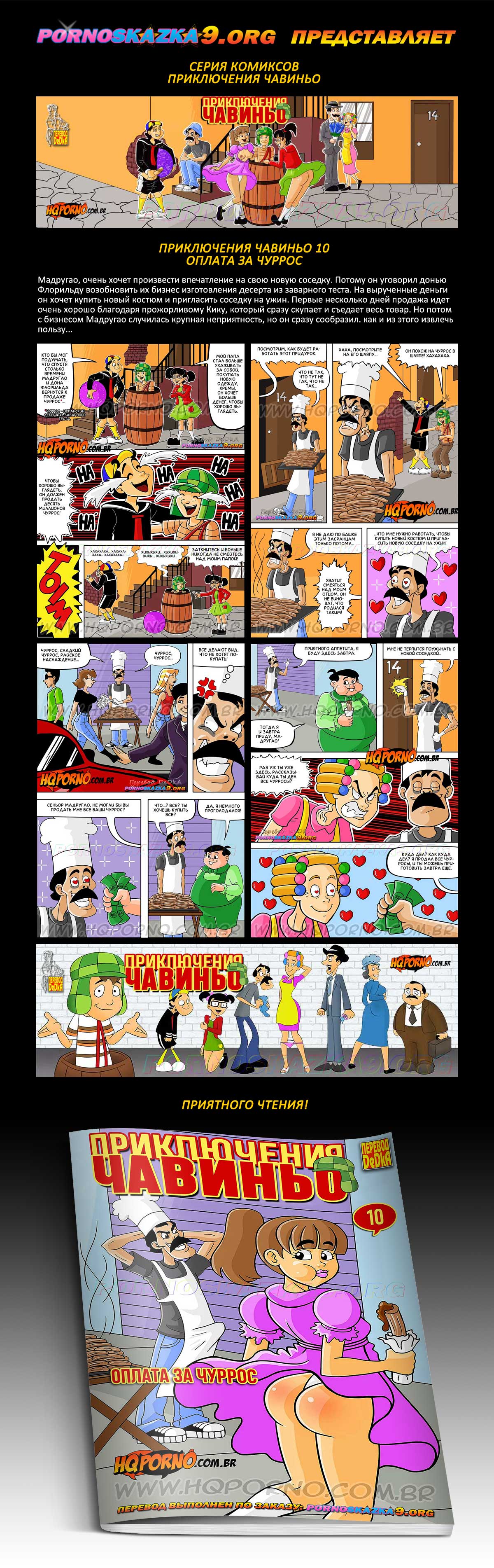 Порно комикс «Приключения Чавиньо. Часть 10. Оплата за чуррос.» Мадругао, очень хочет произвести впечатление на свою новую соседку. Потому он уговорил донью Флорильду возобновить их бизнес изготовления десерта из заварного теста. На вырученные деньги он хочет купить новый костюм и пригласить соседку на ужин. Первые несколько дней продажа идет очень хорошо благодаря прожорливому Кику, который сразу скупает и съедает весь товар. Но потом с бизнесом Мадругао случилась крупная неприятность, но он сразу сообразил. как и из этого извлечь пользу…
